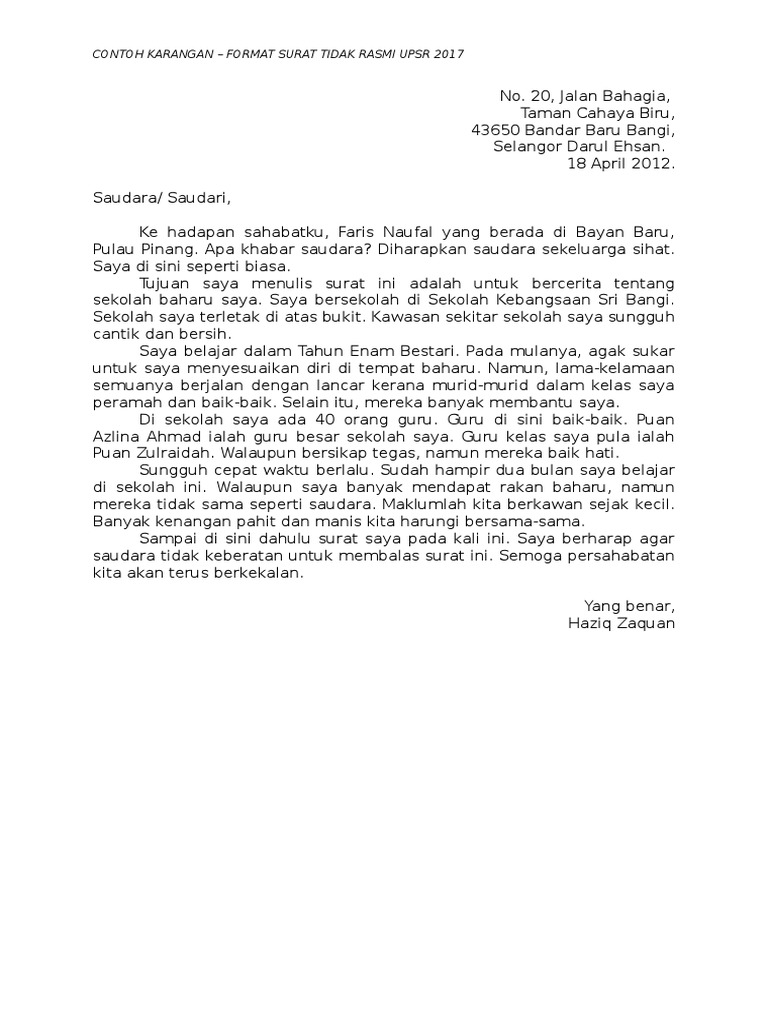 Contoh Surat Kiriman Tidak Rasmi Bahasa Inggeris Upsr Dalam Surat Saudara Yang Lepas Saudara Bertanyakan Persediaan Saya Untuk Menghadapi Upsr